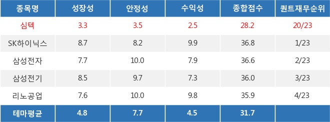 ◆심텍의 퀀트 재무 점수 28.17점, 테마 내 20위