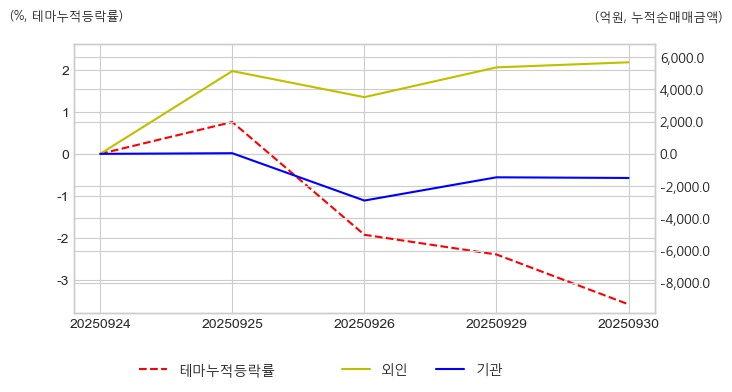 온디바이스 AI 테마는 최근에 소폭의 조정이 있었지만 오늘 다시 반등을 시도하며 전일 대비 3.02% 상승하고 있다. 이 기간 동안 외국인은 관련 종목을 5,685.4억원어치 사모았고, 기관과 개인은 각각 -1,496.44억원, -5,437.05억원 순매도 한 것으로 나타났다.