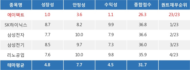 ◆에이팩트의 퀀트 재무 점수 26.32점, 테마 내 23위