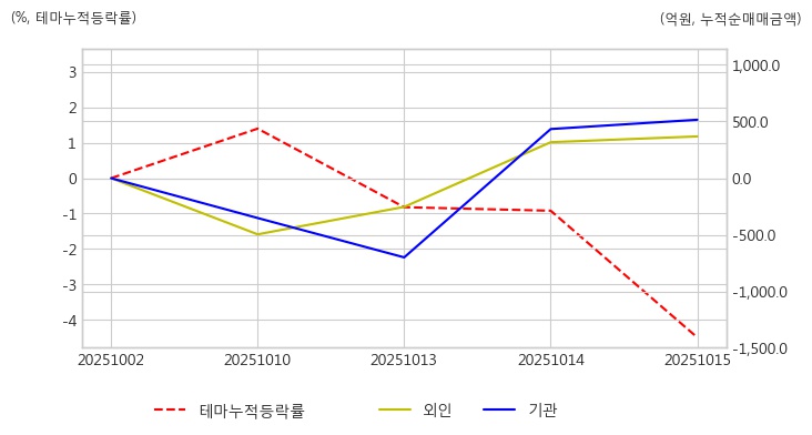 2차전지(LFP/리튬인산철) 테마는 최근에 다소 큰 폭으로 조정을 받았으나 오늘 다시 반등을 시도하며 전일 대비 3.12% 상승하고 있다. 이 기간 동안 외국인이 테마 상승을 주도하며 관련 종목을 368.49억원 어치 사모았고, 기관과 개인이 각각 515.59억원 순매수, -884.26억원 순매도 했다.