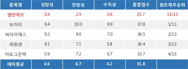 ◆엘앤에프의 퀀트 재무 점수 25.71점, 테마 내 13위