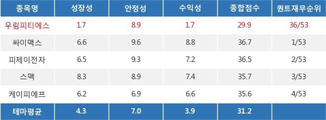 ◆우림피티에스의 퀀트 재무 점수 29.88점, 테마 내 36위