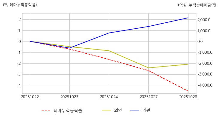 원자력발전소 해체 테마는 최근에 다소 큰 폭으로 조정을 받았으나 오늘 다시 반등을 시도하며 전일 대비 3.16% 상승하고 있다. 이 기간 동안 기관이 테마 상승을 주도하며 관련 종목을 2,161.86억원어치 사모았고, 외국인과 개인이 각각 -2,109.62억원, -265.76억원 순매도했다.