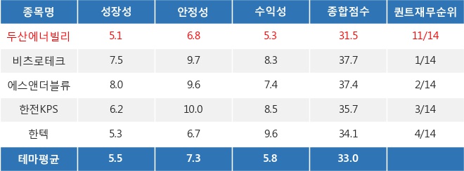 ◆두산에너빌리티의 퀀트 재무 점수 31.55점, 테마 내 11위