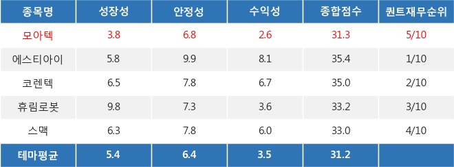 모아텍의 퀀트 재무 점수는 31.27점으로 테마 내에서 5위를 차지했다. 모아텍는 특히 재무 안정성 점수가 비교적 높은 편이었다.